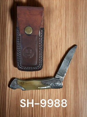 Knife (SH-9988) - 4" Damascus Folding Knife with Flower Bolster & Bone Handle