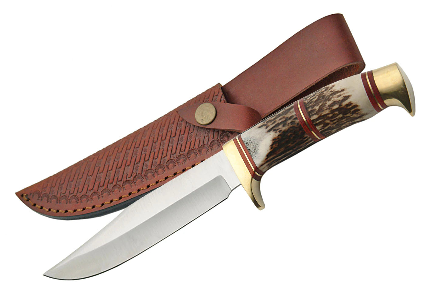This steel wolf stag hunting knife with leather sheath is a great outdoor fixed blade knife to have. This steel stag hunting knife features a sharp steel blade and wolf stag handle. Comes with a leather sheath for blade protection and increased portability.