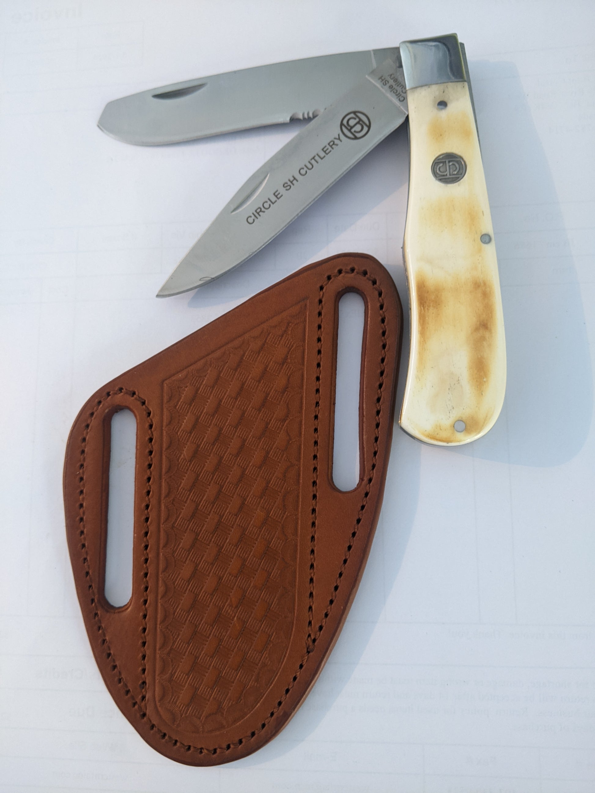 Knife (TX-BBF) Folding Knife, Bone Hand, Leather Sheath