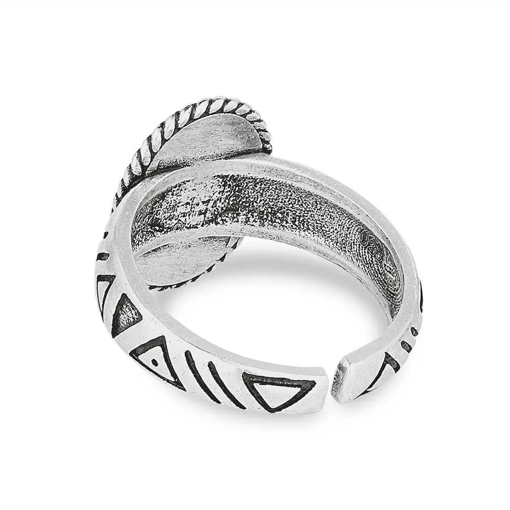 - The antiquing on the Uncovered Beauty Turquoise Ring highlights the details making the detailed etchings on the side stand out. The ring is also open in the back for adjustable sizing.