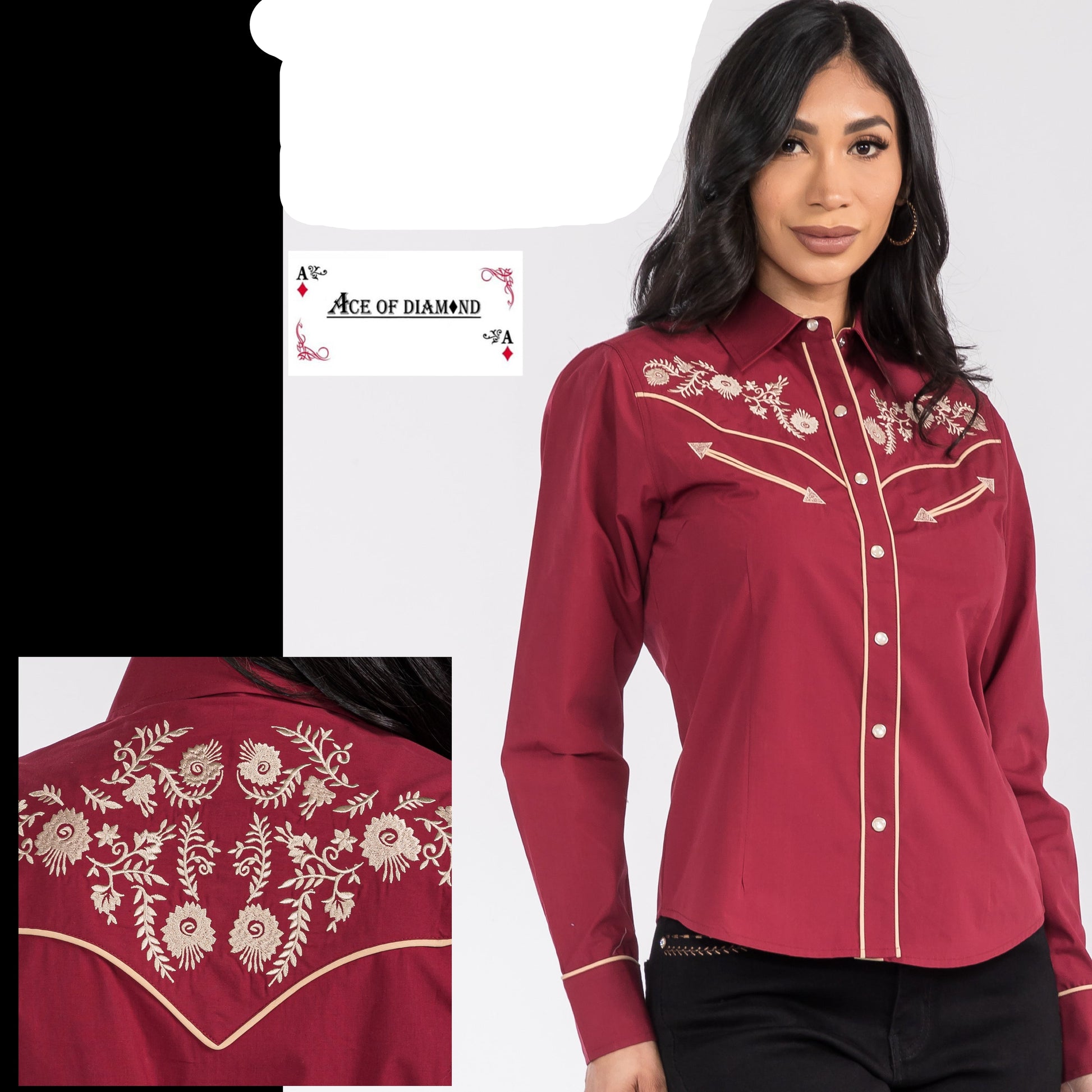 Ladies Western Pearl Snap Button Up Shirt Floral Embroidery